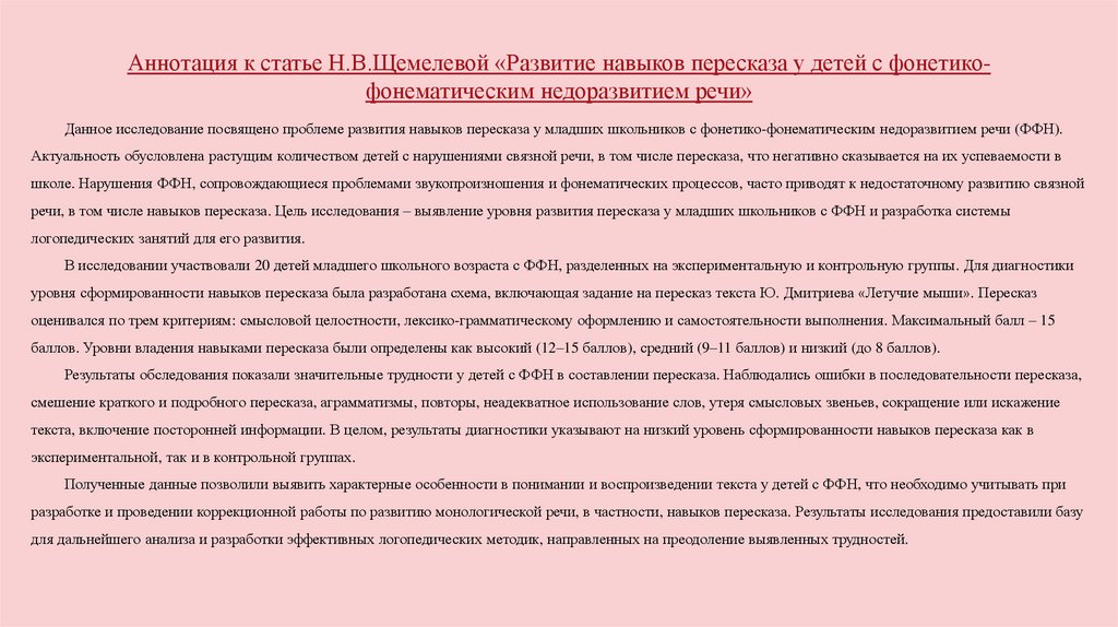 Аннотация к статье Н.В.Щемелевой «Развитие навыков пересказа у детей с фонетикофонематическим недоразвитием речи»Данное исследование посвящено проблеме развития навыков пересказа у младших школьников с фонетико-фонематическим недоразвитием речи (ФФН).