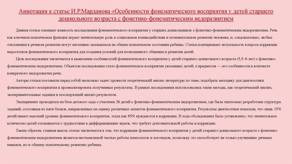 Аннотация к статье И.Р.Марданова «Особенности фонематического восприятия у детей старшегодошкольного возраста с фонетико-фонематическим недоразвитием