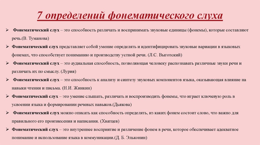 7 определений фонематического слухаФонематический слух – это способность различать и воспринимать звуковые единицы (фонемы), которые составляют