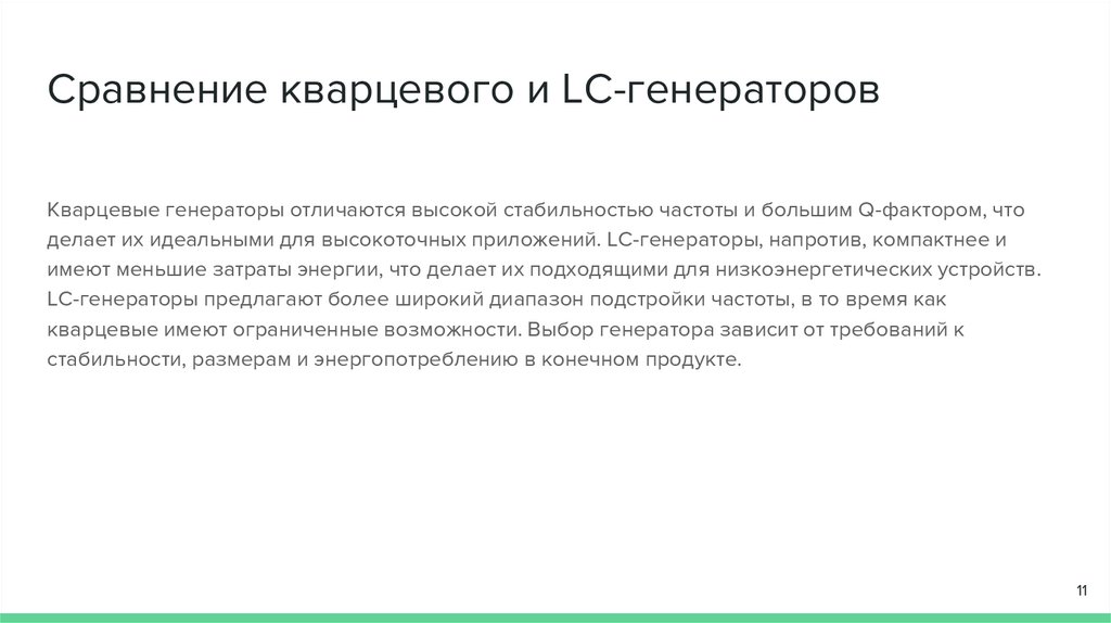 Сравнение кварцевого и LC-генераторовКварцевые генераторы отличаются высокой стабильностью частоты и большим Q-фактором, что