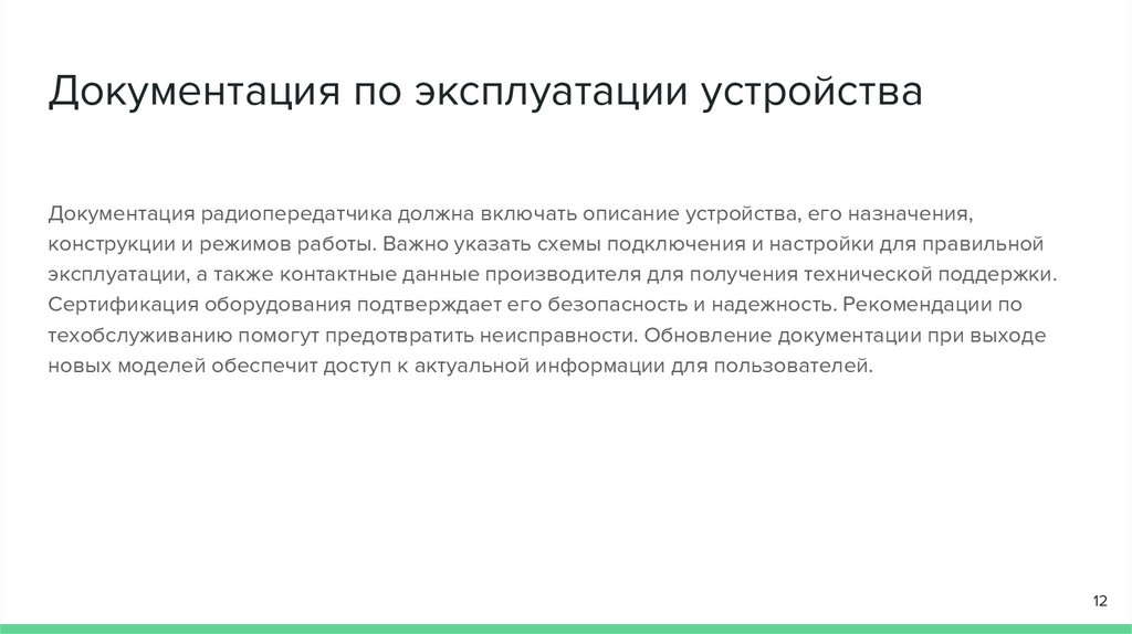 Документация по эксплуатации устройстваДокументация радиопередатчика должна включать описание устройства, его назначения,