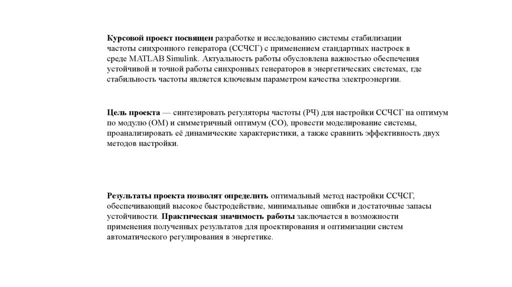 Курсовой проект посвящен разработке и исследованию системы стабилизациичастоты синхронного генератора (ССЧСГ) с применением стандартных настроек в