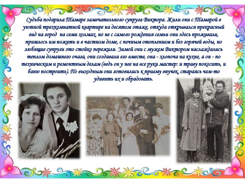 Судьба подарила Тамаре замечательного супруга Виктора. Жили они с Тамарой вуютной трехкомнатной квартире на десятом этаже, откуда открывался прекрасный