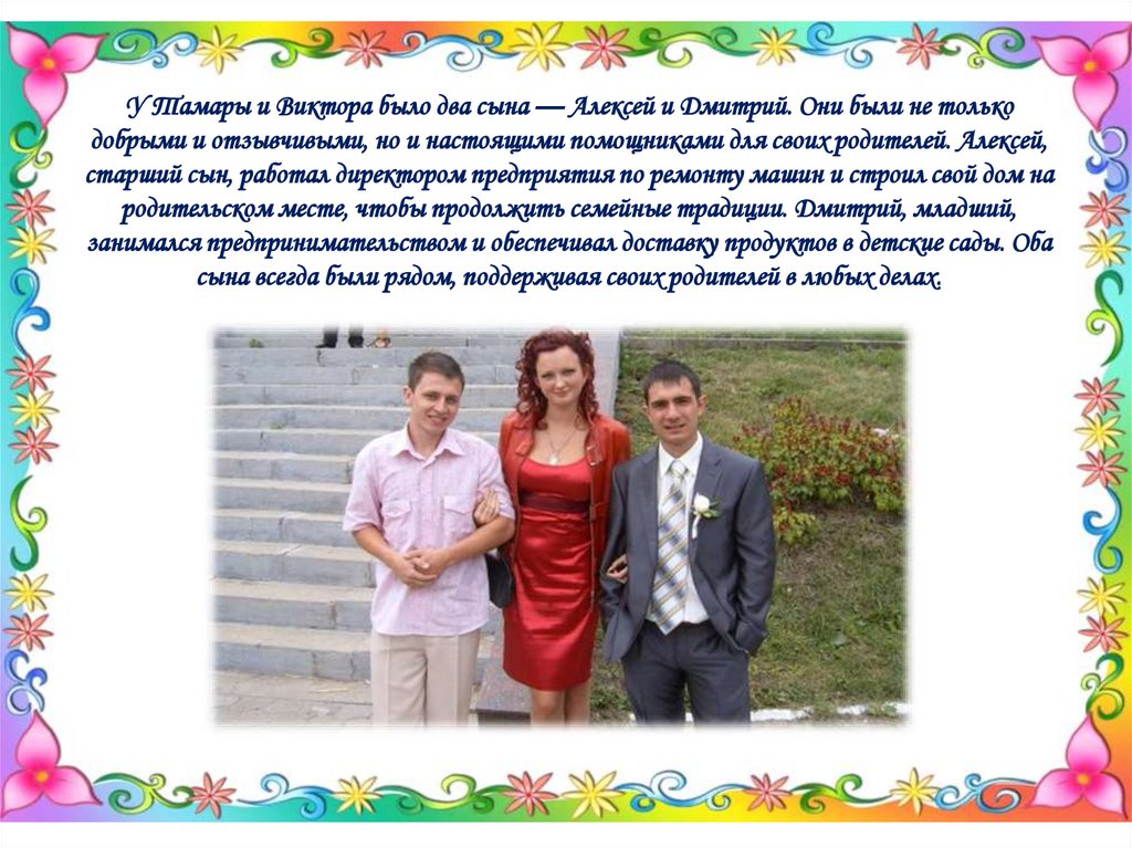 У Тамары и Виктора было два сына — Алексей и Дмитрий. Они были не толькодобрыми и отзывчивыми, но и настоящими помощниками для своих родителей. Алексей,
