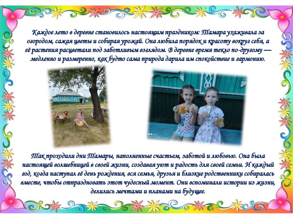Каждое лето в деревне становилось настоящим праздником: Тамара ухаживала заогородом, сажая цветы и собирая урожай. Она любила порядок и красоту вокруг себя, а