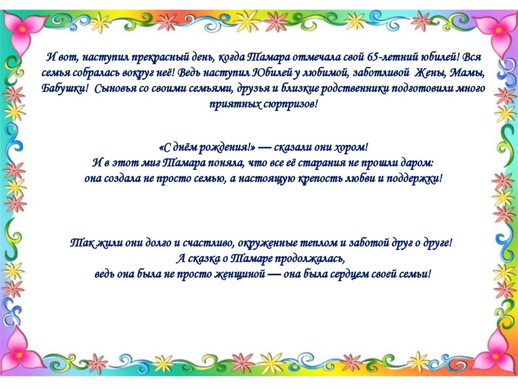 И вот, наступил прекрасный день, когда Тамара отмечала свой 65-летний юбилей! Всясемья собралась вокруг неё! Ведь наступил Юбилей у любимой, заботливой Жены, Мамы,