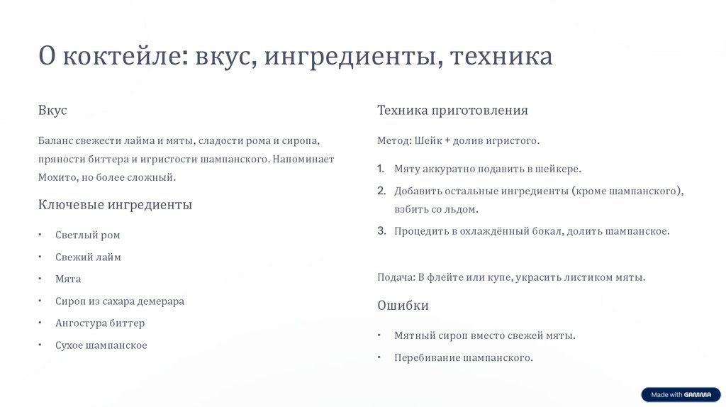 Баланс свежести лайма и мяты, сладости рома и сиропа,