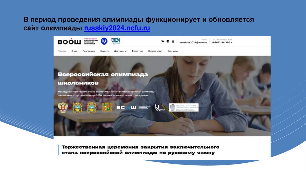 В период проведения олимпиады функционирует и обновляетсясайт олимпиады russkiy2024.ncfu.ru