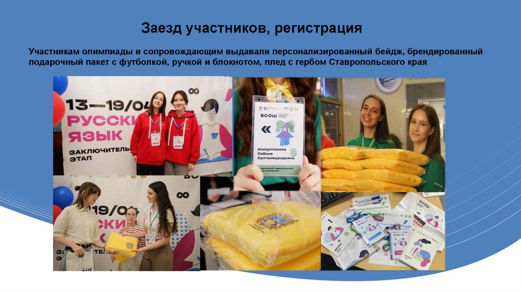 Заезд участников, регистрацияУчастникам олимпиады и сопровождающим выдавали персонализированный бейдж, брендированный