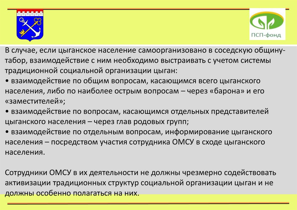 В случае, если цыганское население самоорганизовано в соседскую общинутабор, взаимодействие с ним необходимо выстраивать с учетом системытрадиционной социальной организации цыган: