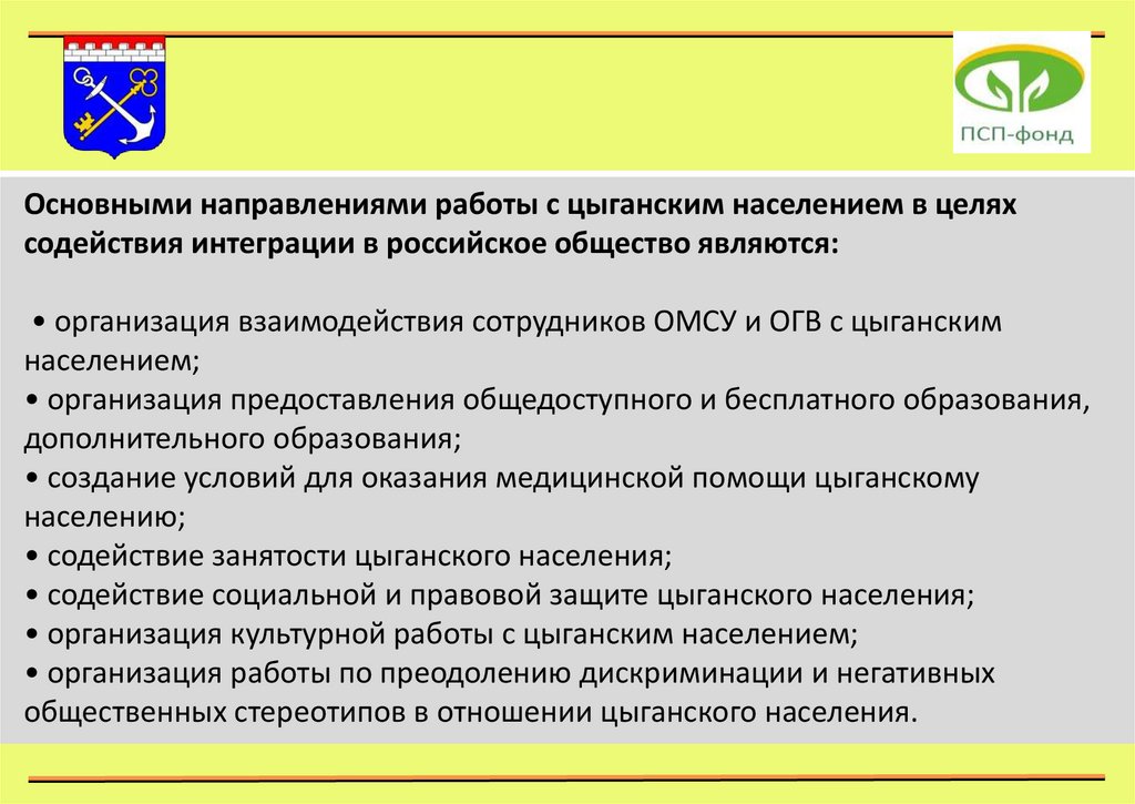 Основными направлениями работы с цыганским населением в целяхсодействия интеграции в российское общество являются: