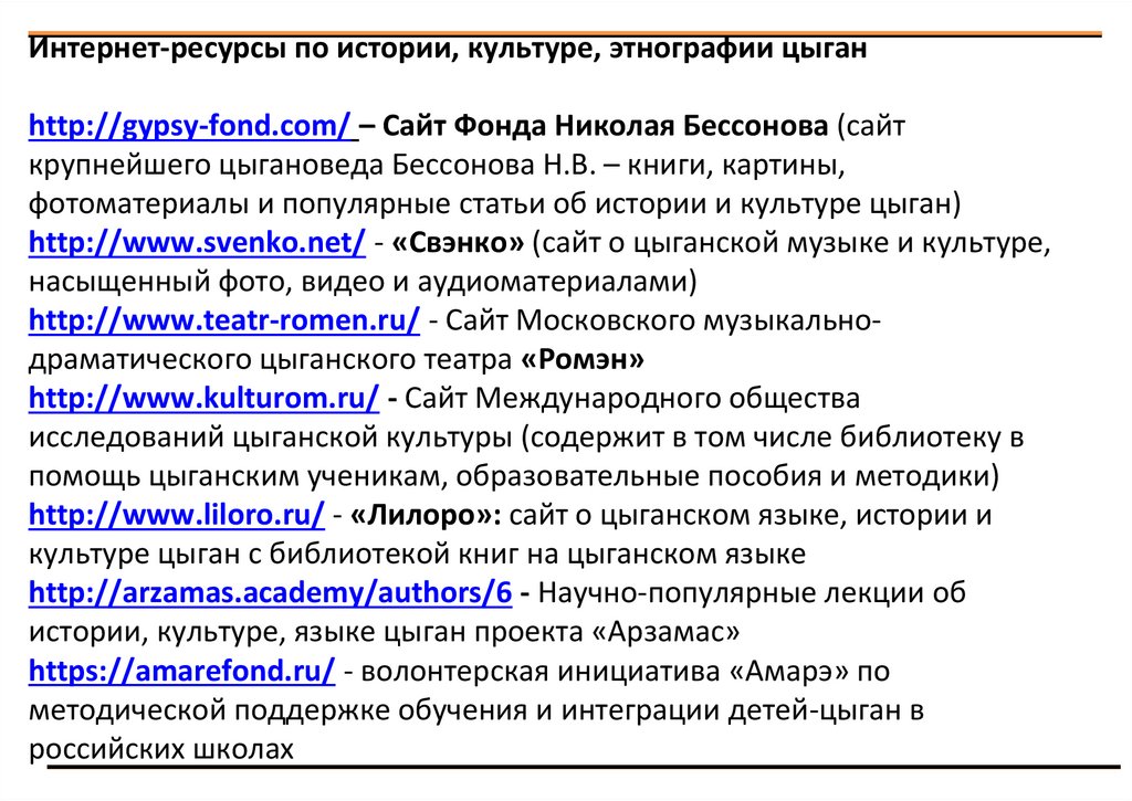 Интернет-ресурсы по истории, культуре, этнографии цыганhttp://gypsy-fond.com/ – Сайт Фонда Николая Бессонова (сайт