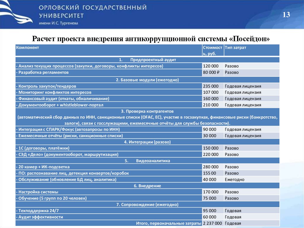 13Расчет проекта внедрения антикоррупционной системы «Посейдон»