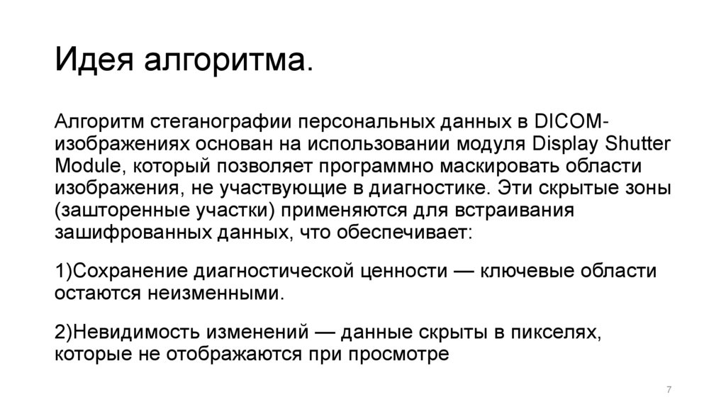 Идея алгоритма.Алгоритм стеганографии персональных данных в DICOMизображениях основан на использовании модуля Display Shutter