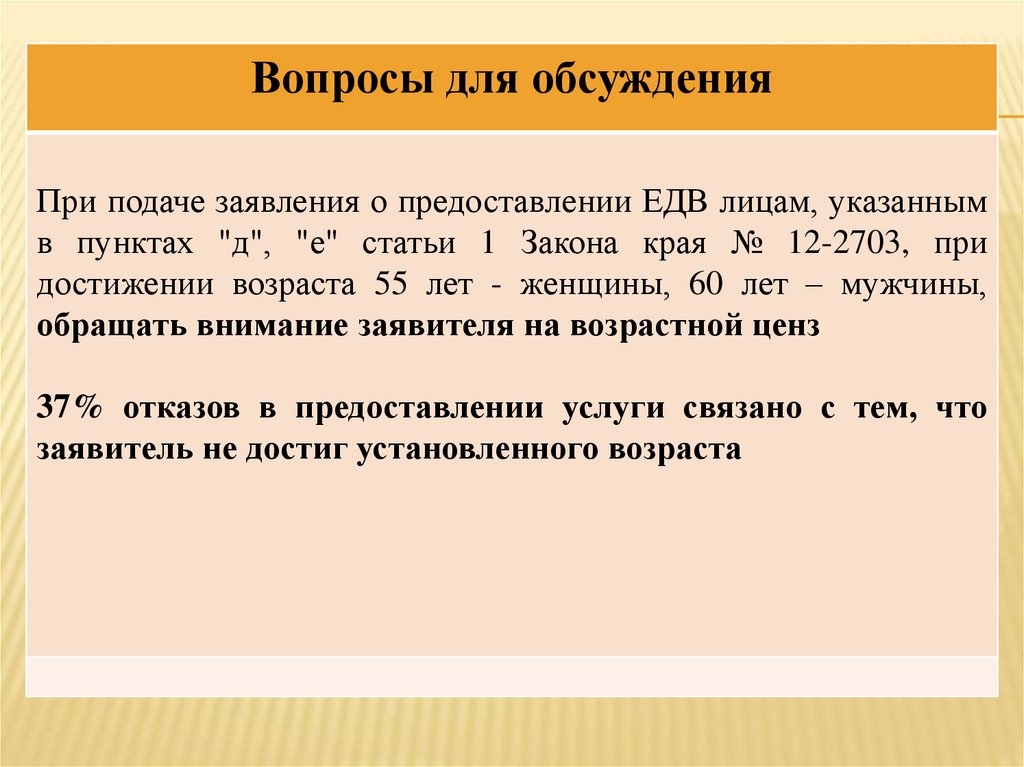 Вопросы для обсужденияПри подаче заявления о предоставлении ЕДВ лицам, указанным