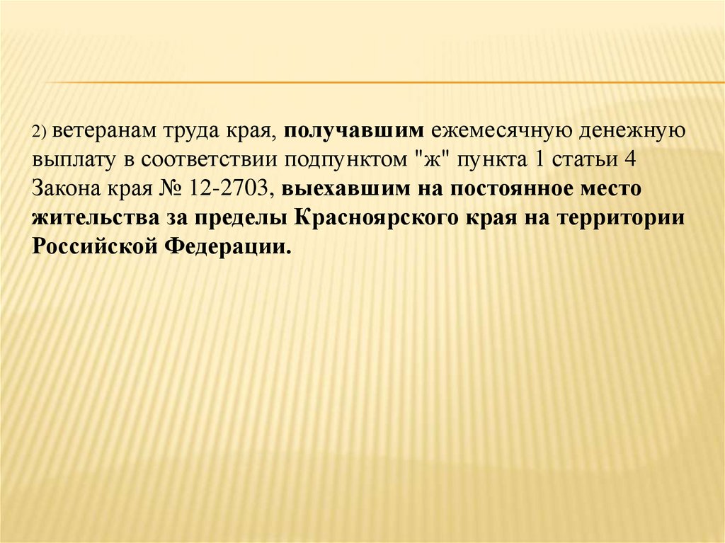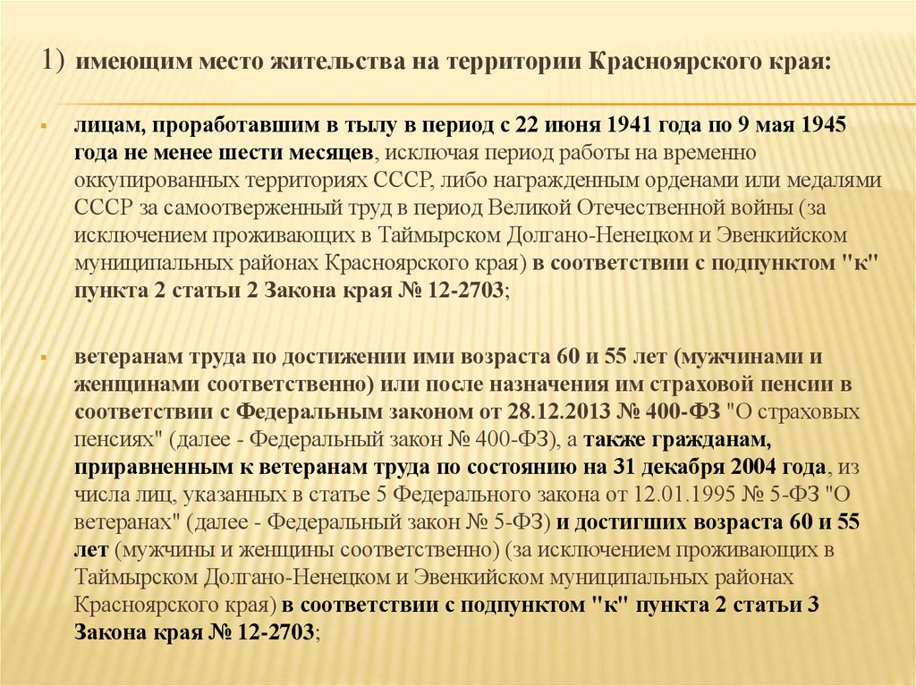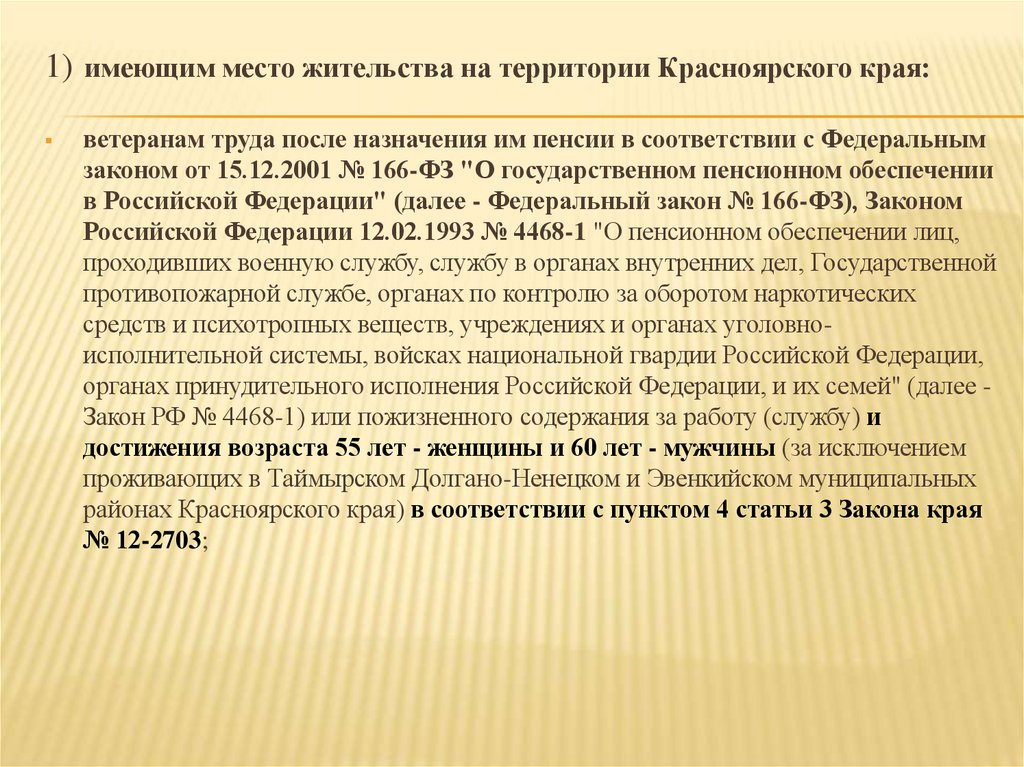 1) имеющим место жительства на территории Красноярского края:ветеранам труда после назначения им пенсии в соответствии с Федеральным