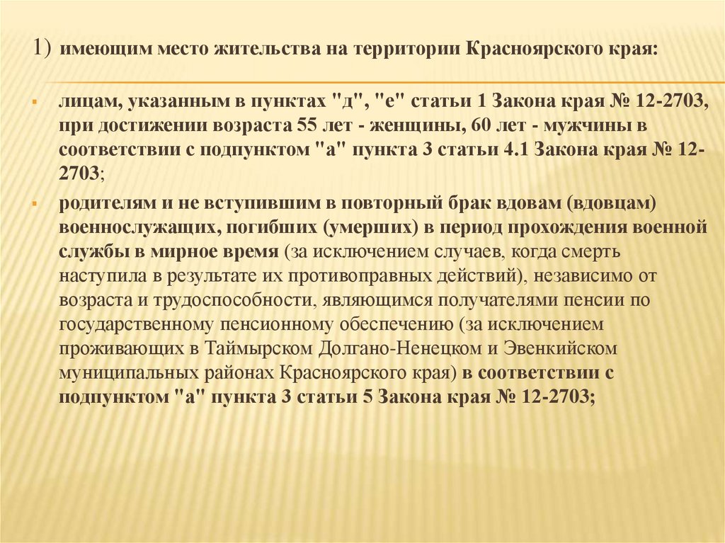 1) имеющим место жительства на территории Красноярского края:лицам, указанным в пунктах "д", "е" статьи 1 Закона края № 12-2703,
