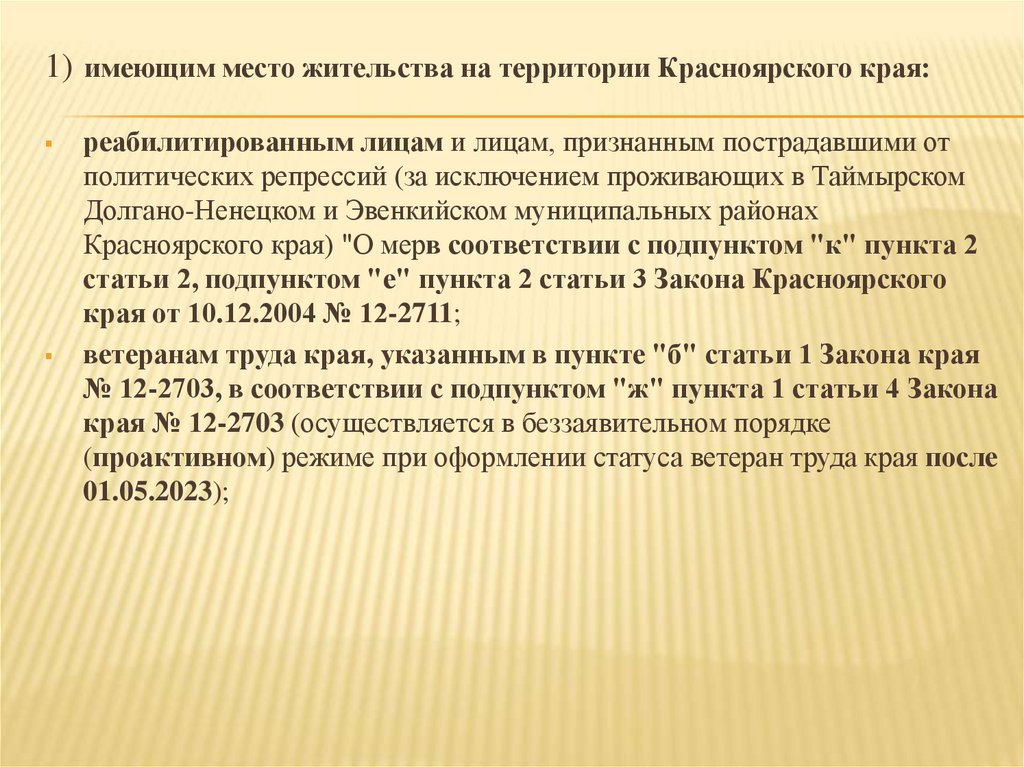 1) имеющим место жительства на территории Красноярского края:реабилитированным лицам и лицам, признанным пострадавшими от