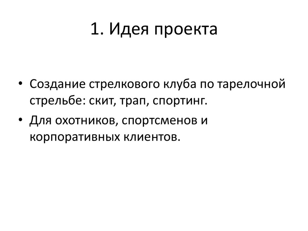 1. Идея проекта• Создание стрелкового клуба по тарелочной
