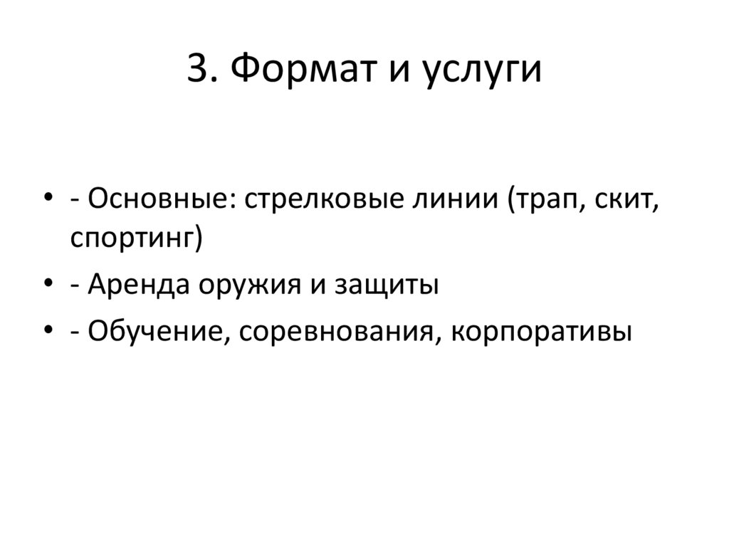3. Формат и услуги• - Основные: стрелковые линии (трап, скит,