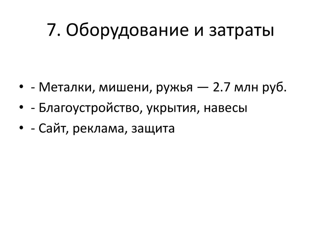 7. Оборудование и затраты• - Металки, мишени, ружья — 2.7 млн руб.