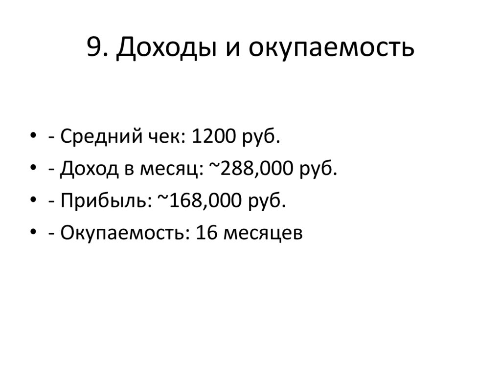 9. Доходы и окупаемость• - Средний чек: 1200 руб.