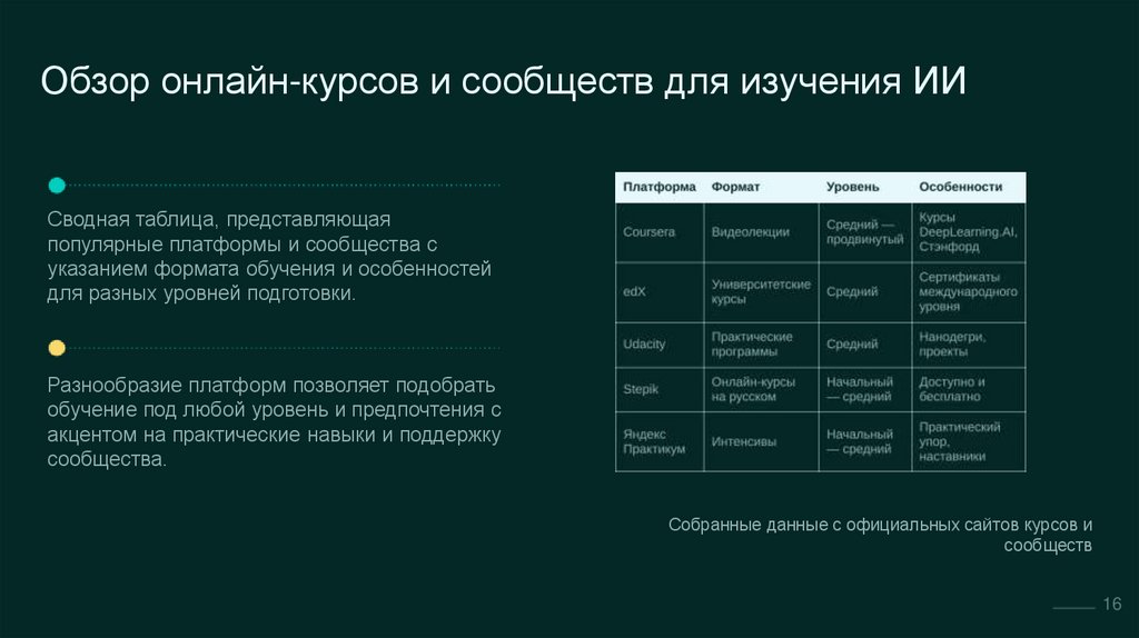 Обзор онлайн-курсов и сообществ для изучения ИИСводная таблица, представляющая