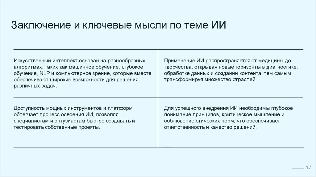 Заключение и ключевые мысли по теме ИИИскусственный интеллект основан на разнообразных
