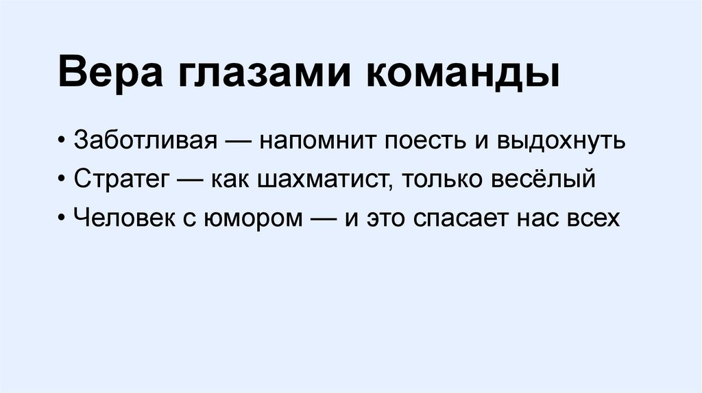 Вера глазами команды• Заботливая — напомнит поесть и выдохнуть