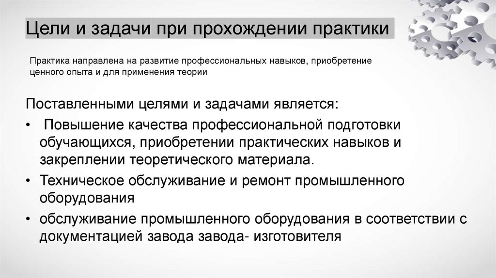 Цели и задачи при прохождении практикиПрактика направлена на развитие профессиональных навыков, приобретение