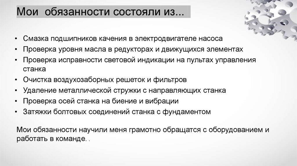 Мои обязанности состояли из...• Смазка подшипников качения в электродвигателе насоса