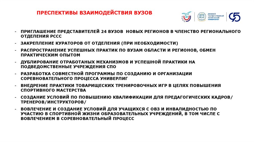 с федерациями, лигами, другими вузами, организацию спортивных мероприятий
