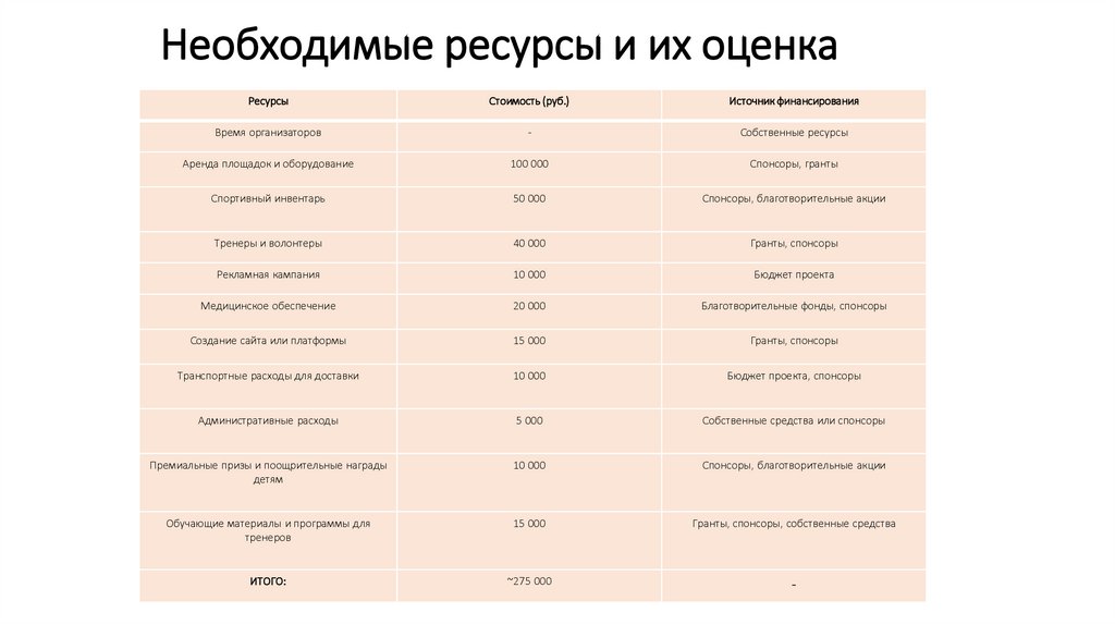 Необходимые ресурсы и их оценкаРесурсы