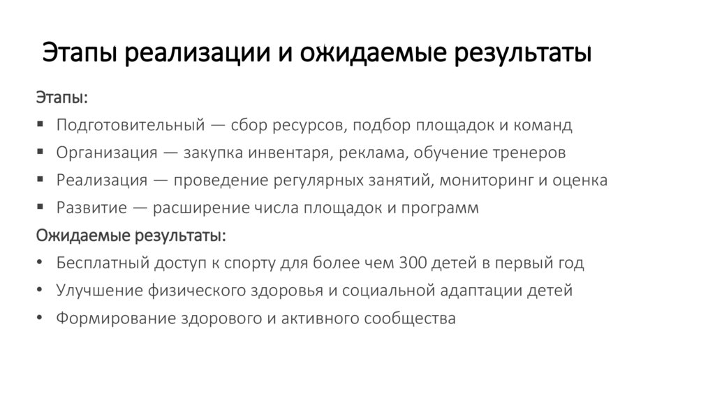 Этапы реализации и ожидаемые результатыЭтапы: