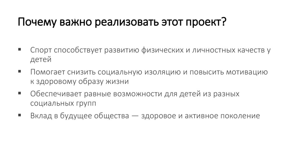 Почему важно реализовать этот проект?Спорт способствует развитию физических и личностных качеств у