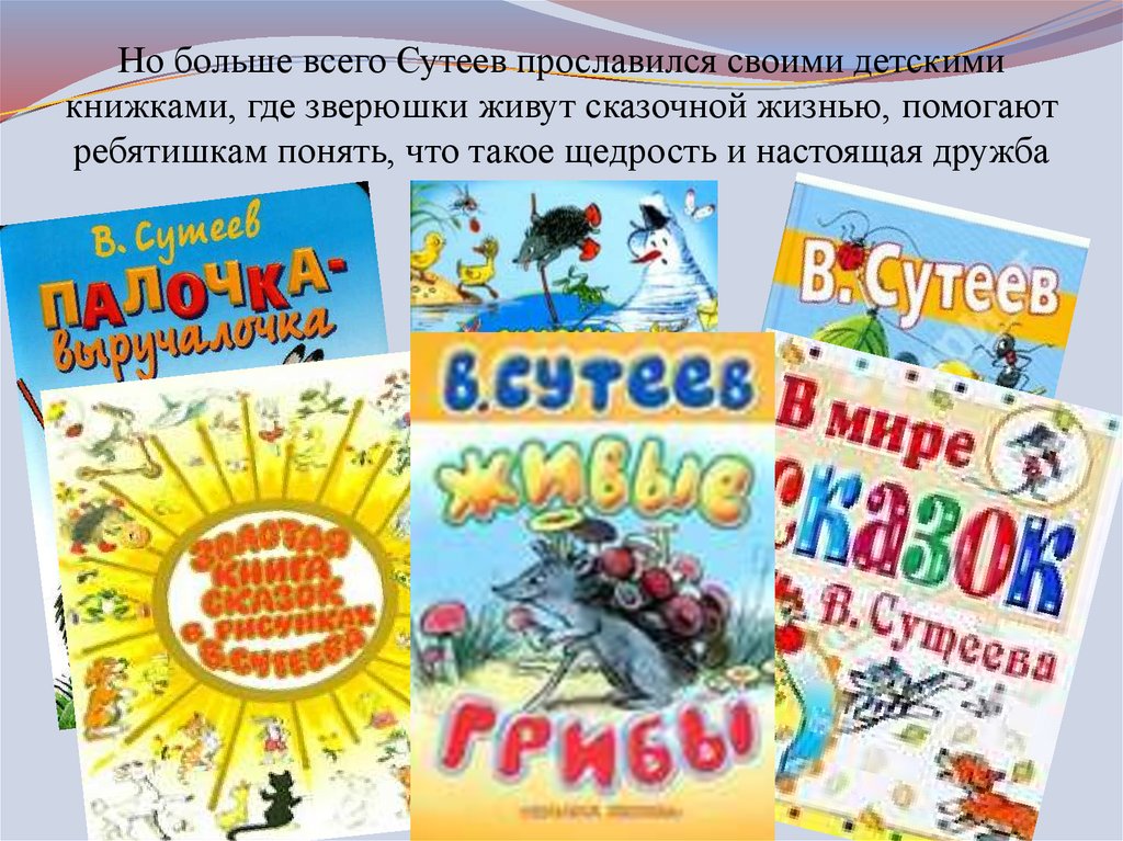 Но больше всего Сутеев прославился своими детскимикнижками, где зверюшки живут сказочной жизнью, помогают