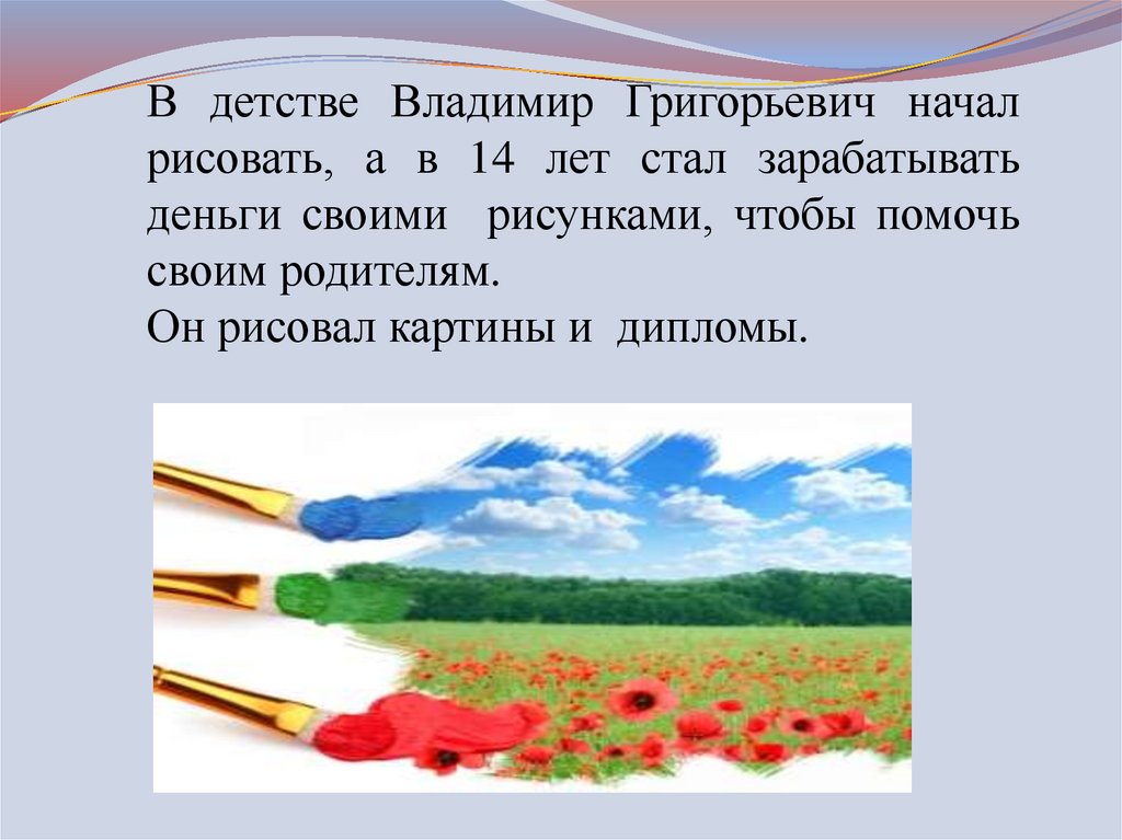 В детстве Владимир Григорьевич началрисовать, а в 14 лет стал зарабатывать