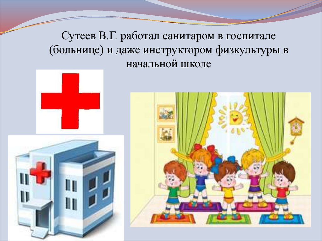 Сутеев В.Г. работал санитаром в госпитале(больнице) и даже инструктором физкультуры в