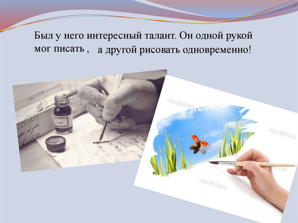 Был у него интересный талант. Он одной рукоймог писать , а другой рисовать одновременно!