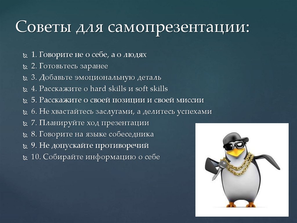 Советы для самопрезентации:1. Говорите не о себе, а о людях