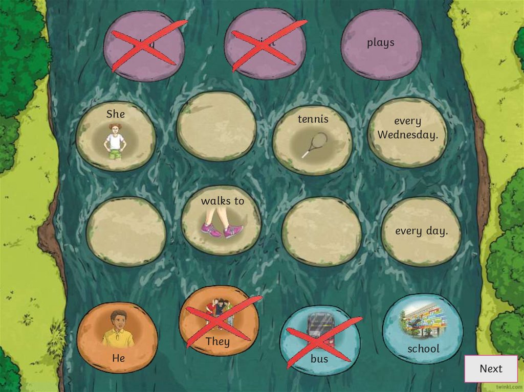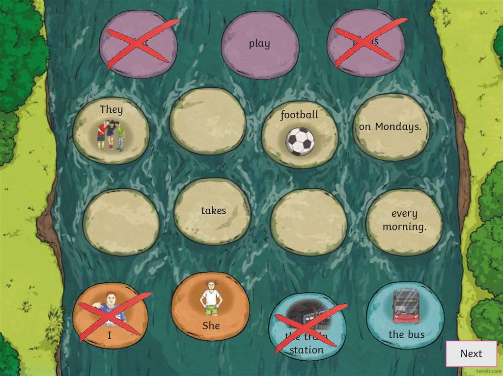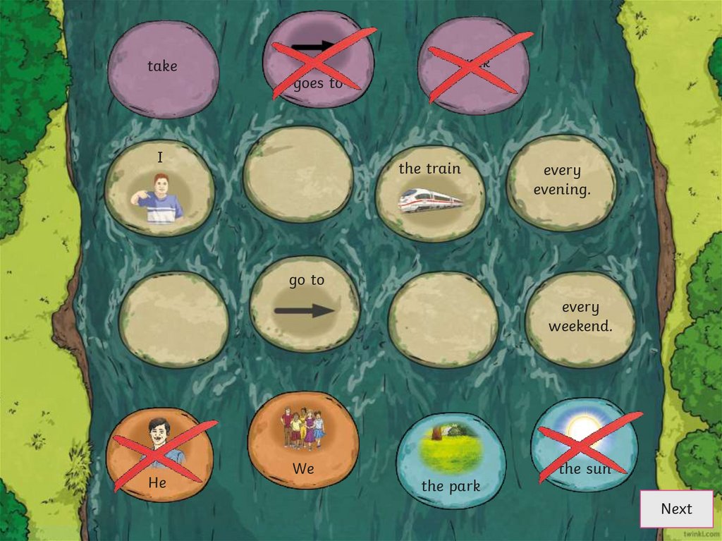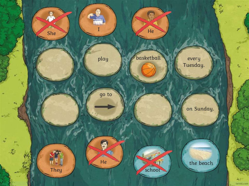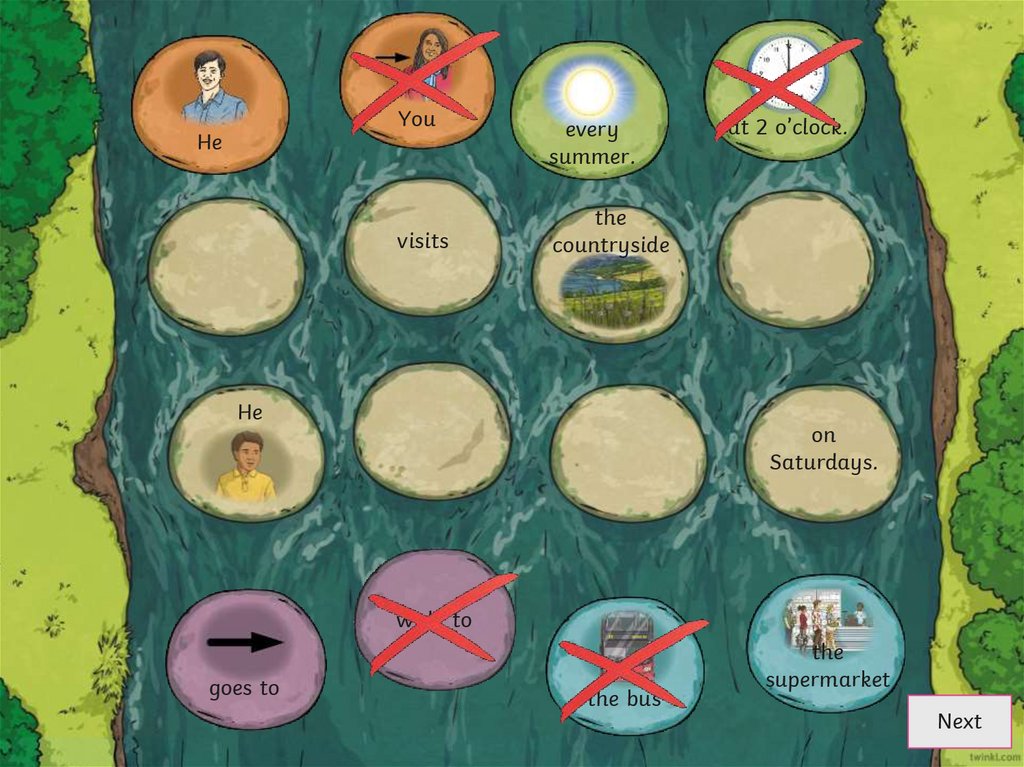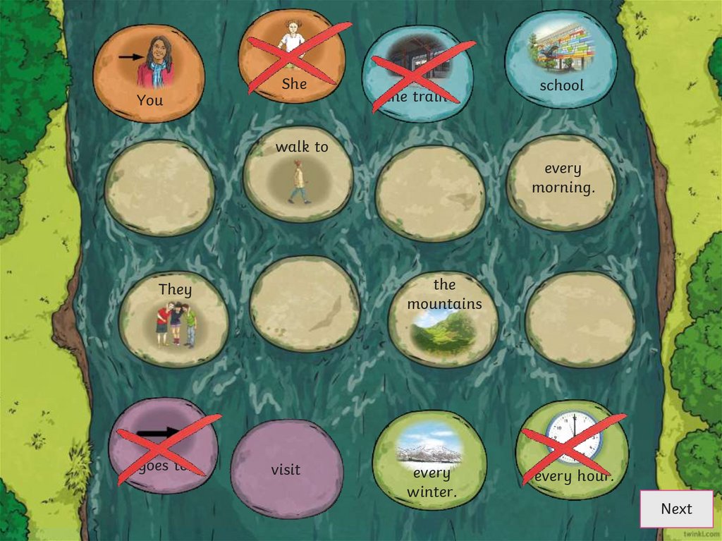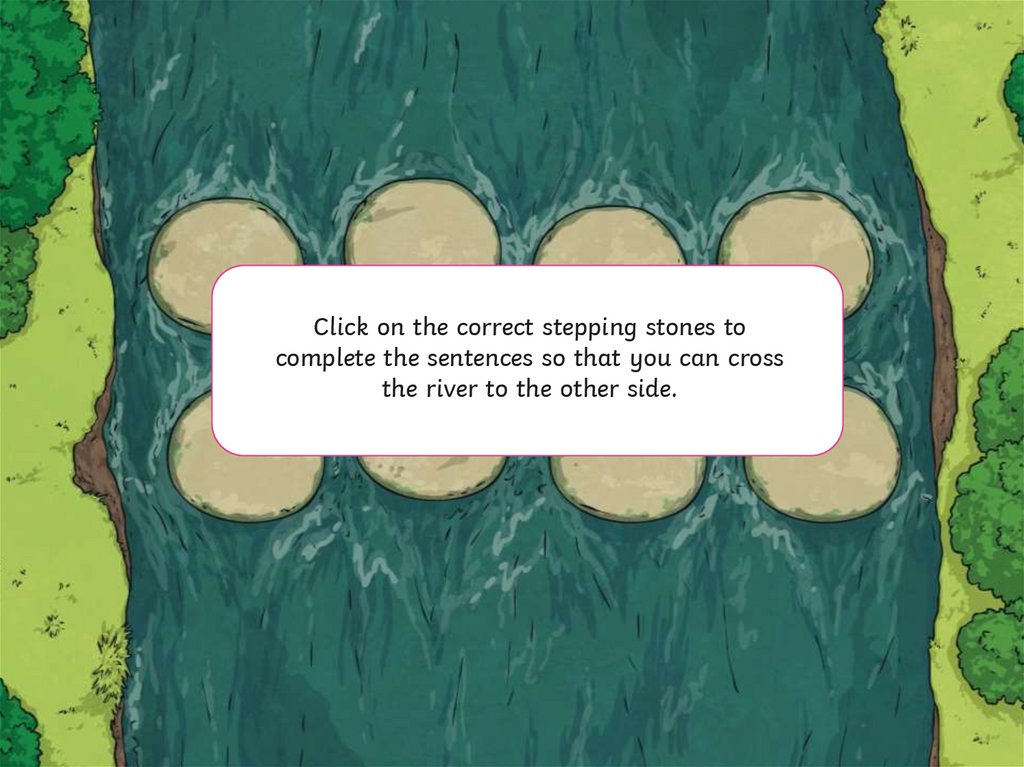 Click on the correct stepping stones tocomplete the sentences so that you can cross