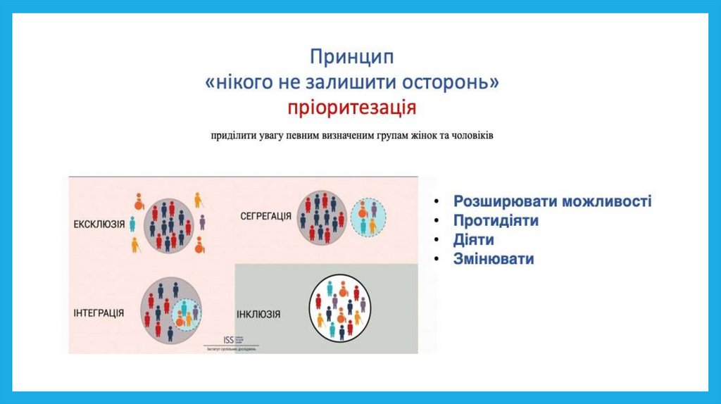 частини людства; рівності можливостей; доступності; рівності між чоловіками й жінками; поваги до прав