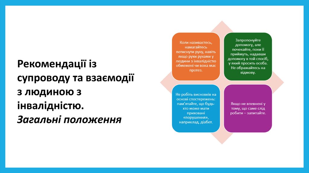 • ▫ Конвенція базується на принципах: поваги до гідності; недискримінації; залучення та включення в