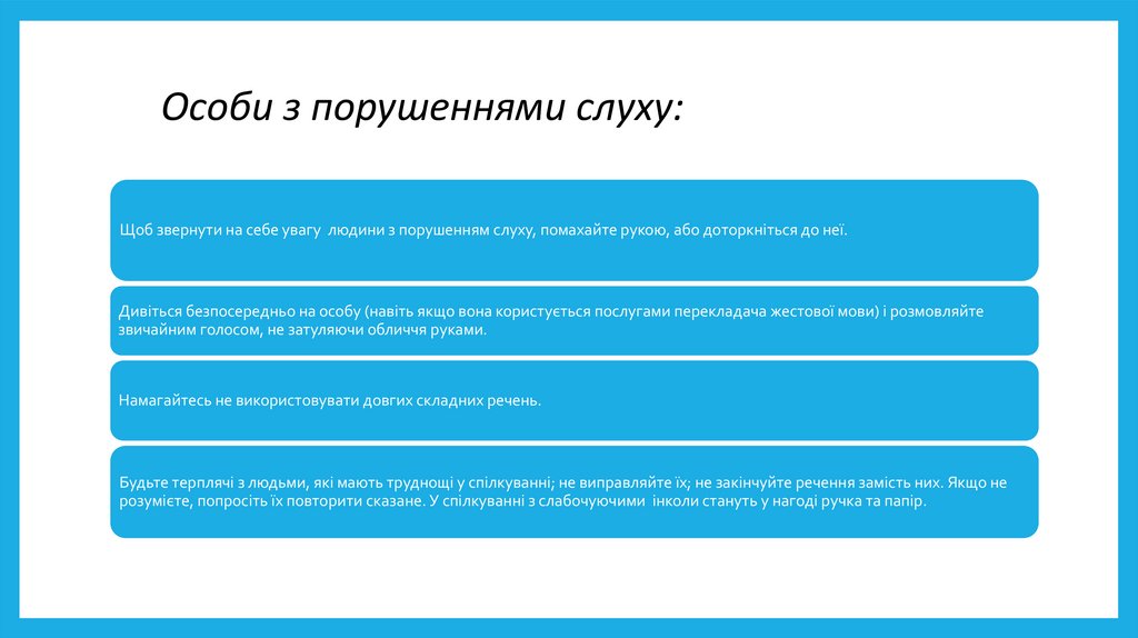 Особи з порушеннями слуху:Щоб звернути на себе увагу людини з порушенням слуху, помахайте рукою, або доторкніться до неї.