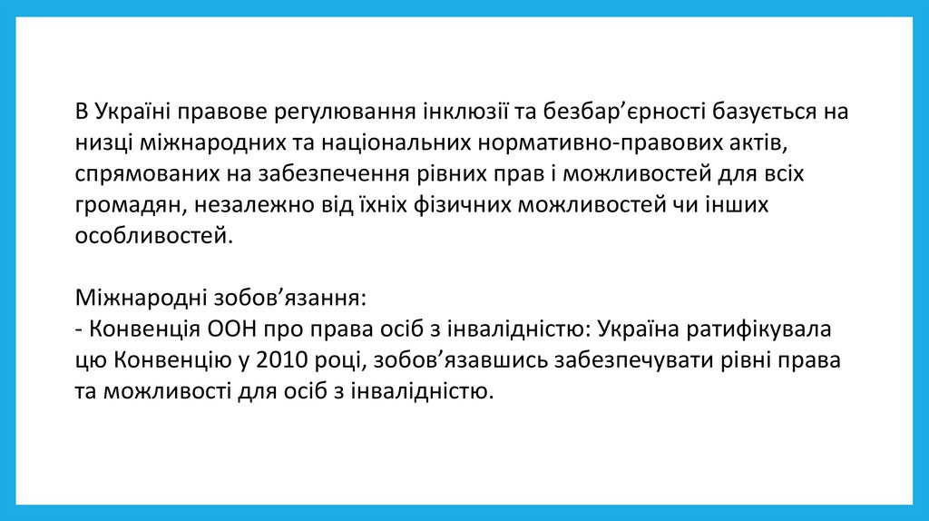 В Україні правове регулювання інклюзії та безбар’єрності базується нанизці міжнародних та національних нормативно-правових актів,