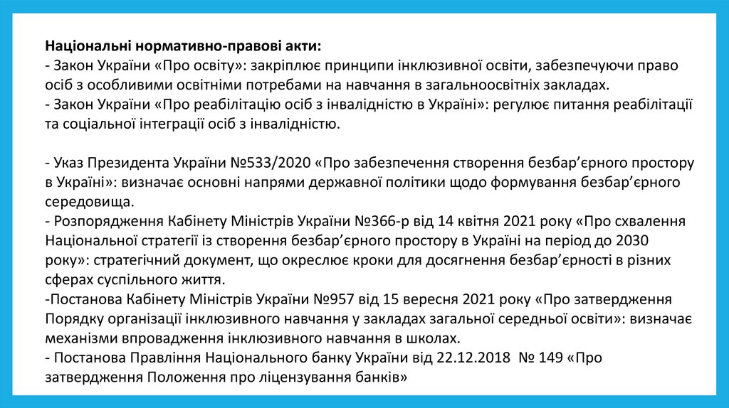 Національні нормативно-правові акти:- Закон України «Про освіту»: закріплює принципи інклюзивної освіти, забезпечуючи право