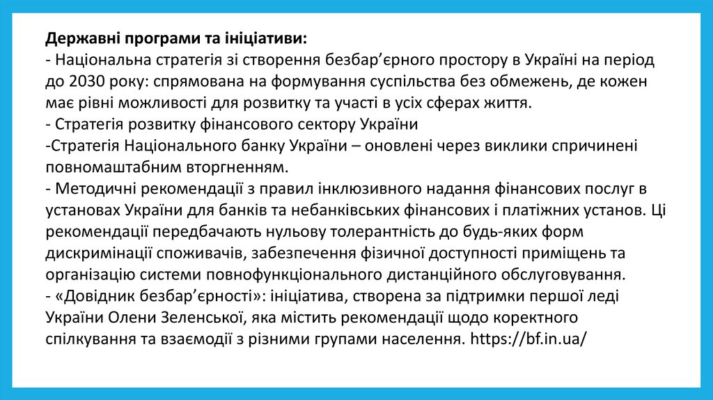 Державні програми та ініціативи:- Національна стратегія зі створення безбар’єрного простору в Україні на період