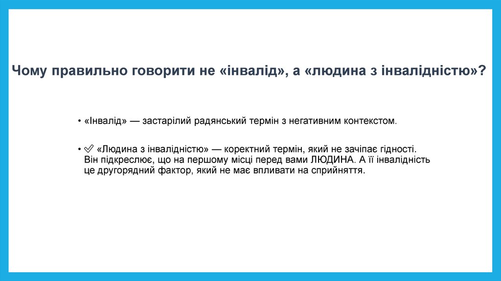 • Отже, повертаючись до головного питання, чому термін «людина з інвалідністю» — коректний?