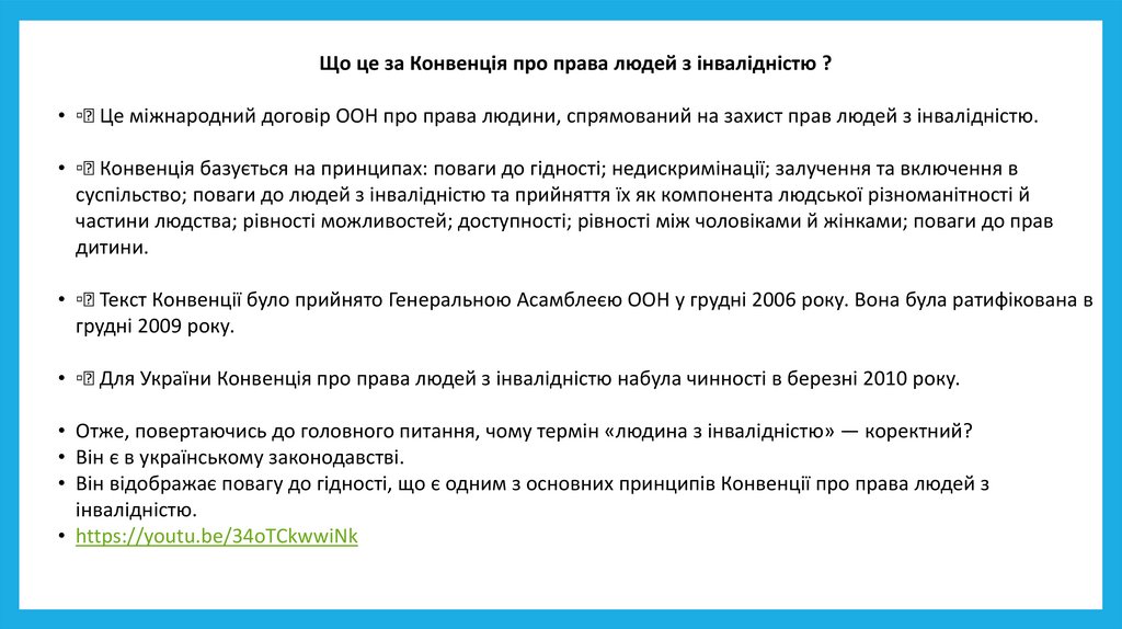 Що це за Конвенція про права людей з інвалідністю ?• ▫ Це міжнародний договір ООН про права людини, спрямований на захист прав людей з інвалідністю.