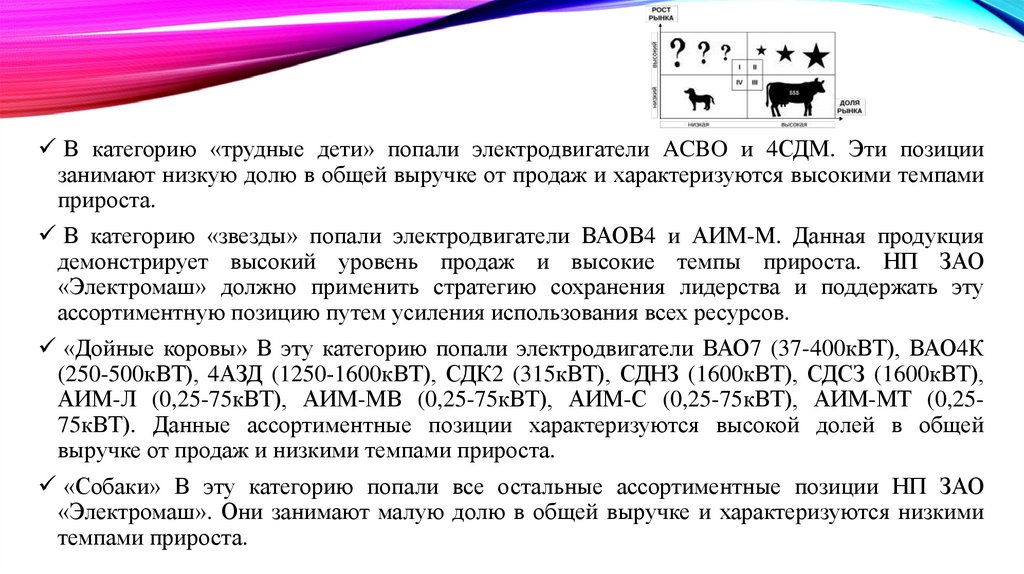 В категорию «трудные дети» попали электродвигатели ACBO и 4СДМ. Эти позициизанимают низкую долю в общей выручке от продаж и характеризуются высокими темпами